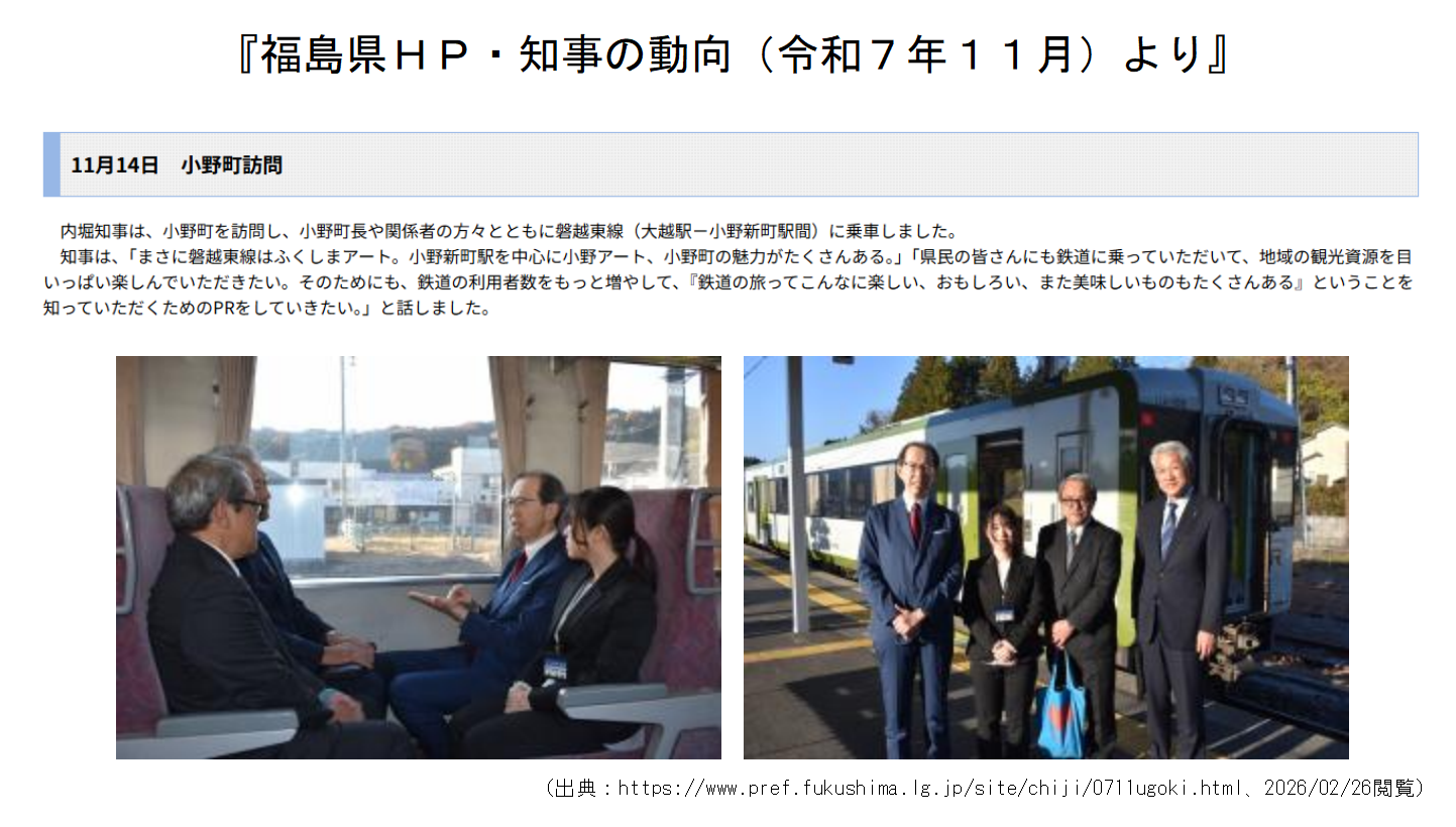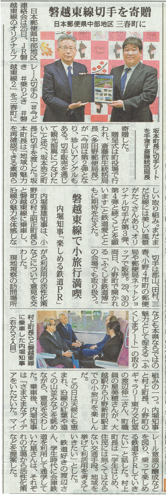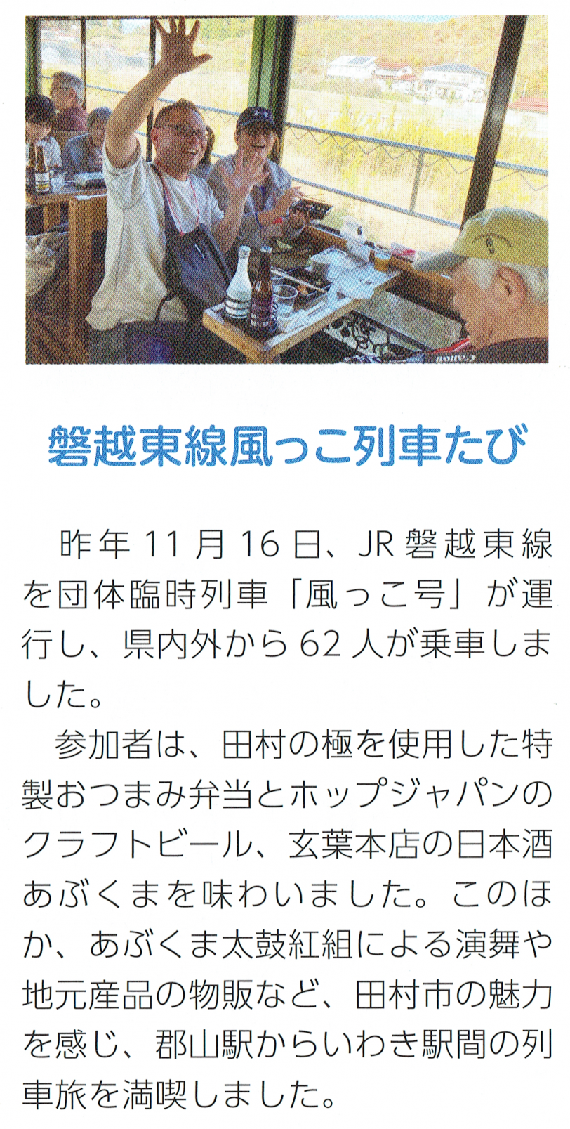 | (出典:「たむら市政だより 2026年2月号」P10) (出典:福島民報 2025年(令和7年)11月29日(土) ・12面・県南版) (出典:福島民報 2024年(令和6年)10月27日(日) ・26面) (出典:福島民報 2024年(令和6年)9月24日(火) ・3面) (出典:福島民報 2024年(令和6年)8月10日(土) ・3面) 磐越東線活性化対策協議会総会: (出典:福島民報 2024年(令和6年)5月28日(火) 9面県南版) (出典:福島民報 2024年(令和6年)2月15日(木) 1面) 《東方文化堂からの提案》 ① 統計データの充実・将来にわたる比較データ用として 「有人駅を含む全駅の一斉調査」を要望します。 ② JR東日本の協力を期待します。 ・Suicaの利用状況(→ ビックデータ) ・自動券売機の販売内訳(→ 各駅での乗車人数) ・ワンマンカーでの整理券の回収枚数(→ 各駅での乗車人数) など (出典:福島民報 2024年(令和6年)2月15日(木) 2面) (出典:福島民報 2024年(令和6年)2月12日(月) 3面) | 《鉄活セミナー》 | | 司会・進行 鈴木沙由里 | いわき市長 内田広之 | 交通ジャーナリスト 鈴木文彦 | 東方文化堂 渡邊伸二(鉄援隊々員) | | | | | | | | 《東方文化堂 アリオス出張展示》 | | | | | | 最下段の写真は、東方文化堂内での仮置き状態です | | 《親子鉄道工作教室》 | | | |