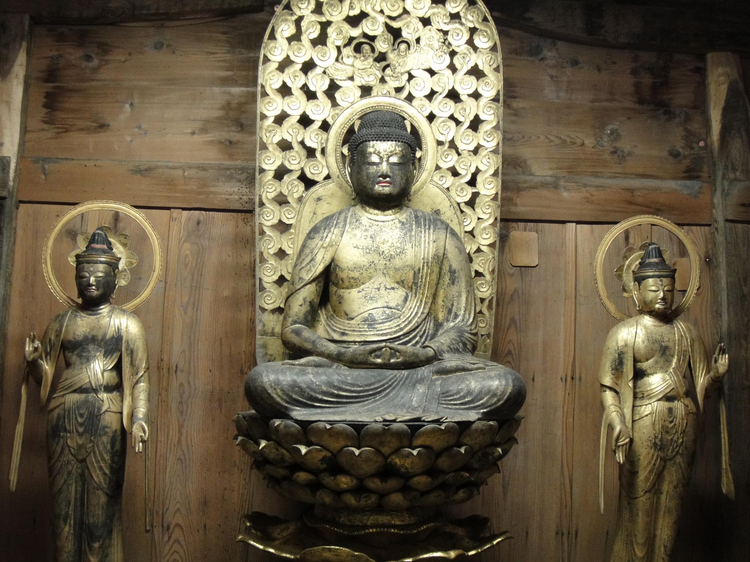 (以上、全て渡邊伸二撮影) 小野町・無量寺の桜(小野赤沼無量寺しだれ桜) 2022年1月25日の写真です。満開になるのが楽しみです!(渡邊伸二撮影) 小野町・無量寺 『木造阿弥陀如来及び両脇侍像(福島県指定重要文化財(彫刻)』 平安時代末期作の『三尊像』が約2年間の修復を終え、1月20~1月26日に特別公開されました(通常は、非公開)。 今回の修復で、『阿弥陀如来像』の台座の順番の見直し、『両脇侍像(観音菩薩・勢至菩薩)』の左右の配置の見直し等が行われました。 修復前後の写真をご覧ください。 修復前 (出典:おのまち文化財MAP) | 修復後 (2022/1/25、渡邊伸二撮影) | 修復後の『阿弥陀如来像』の台座 (2022/1/25、渡邊伸二撮影) |