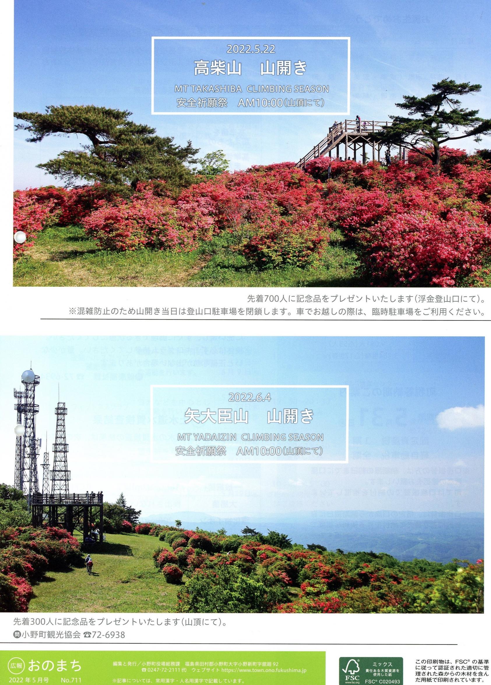 自ら手を挙げて参加した4人娘 祭りは夜遅くまで行われ、この後、御神体は神社に還御 時代に合わせて形を変えたが、 神輿渡御と御仮舎の意義を継承した、 若連・氏子総代・氏子の皆さまに大感謝!! 高柴山・矢大臣山 山開き出典:『広報 おのまち』2022年5月号、小野町役場発行 令和4年の軒菖蒲今年も軒菖蒲を飾りました(2022/05/05、渡邊伸二撮影) 2022年(令和4年)の小野町の桜 東方文化堂脇・つぼみ (2022/04/10) | 東方文化堂脇・咲始め (2022/04/11) | 東方化堂脇・満開 (2022/04/12) | 塩釜神社 (2022/04/12) | 小町温泉・太田屋旅館 (2022/04/13) | 稲荷橋・リカちゃん (2022/04/13) | こまち桜回廊 (2022/04/17) | 小野中学校から見下ろす (2022/04/17) | JR・陽春磐越東西線号 (2022/04/17) | 小野赤沼・無量寺 (2022/04/17) | 夏井川千本桜 (2022/04/17) | 夏井地区農村公園から見下ろし JR夏井駅と夏井千本桜 (2022/04/17) |