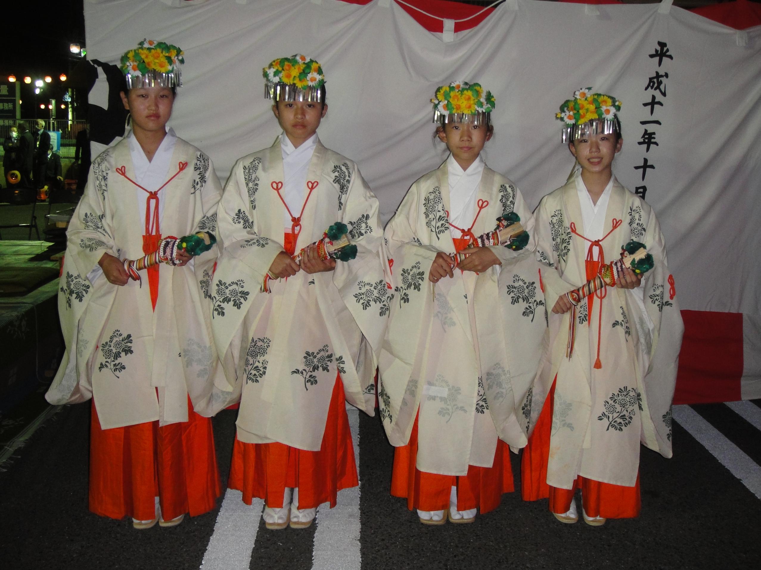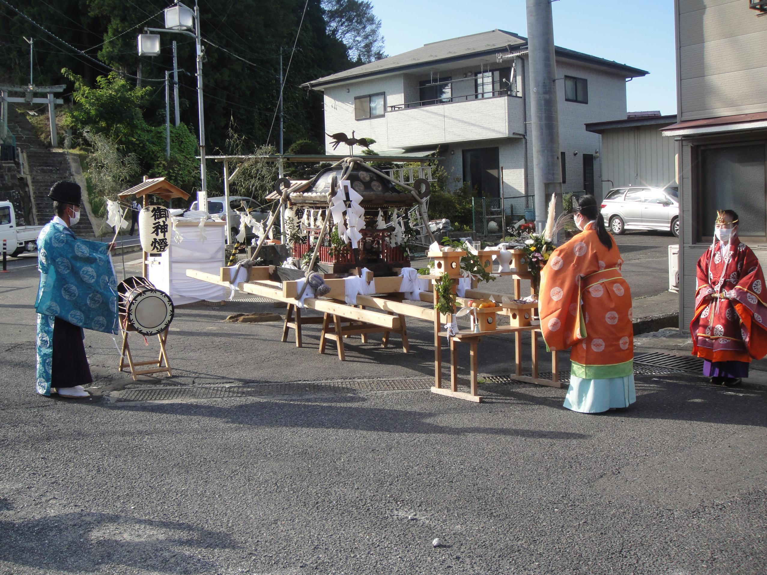 福島県田村郡小野町大字小野新町と大字谷津作字平舘三世代が一丸となり、見事に「お祭り復活!」 右側が鹽竈神社のある明神山 神輿渡御(御神体が町内を巡り、氏子の元に来てくれる) 字本町の旗場(柱に)幡を挙げなかったが、(祭壇の最上位・最前列に)幡を挙げた! 御仮舎での「浦安の舞」奉納 (神社の直ぐ脇でも、御仮舎を設け御神体にお休みいただいた)