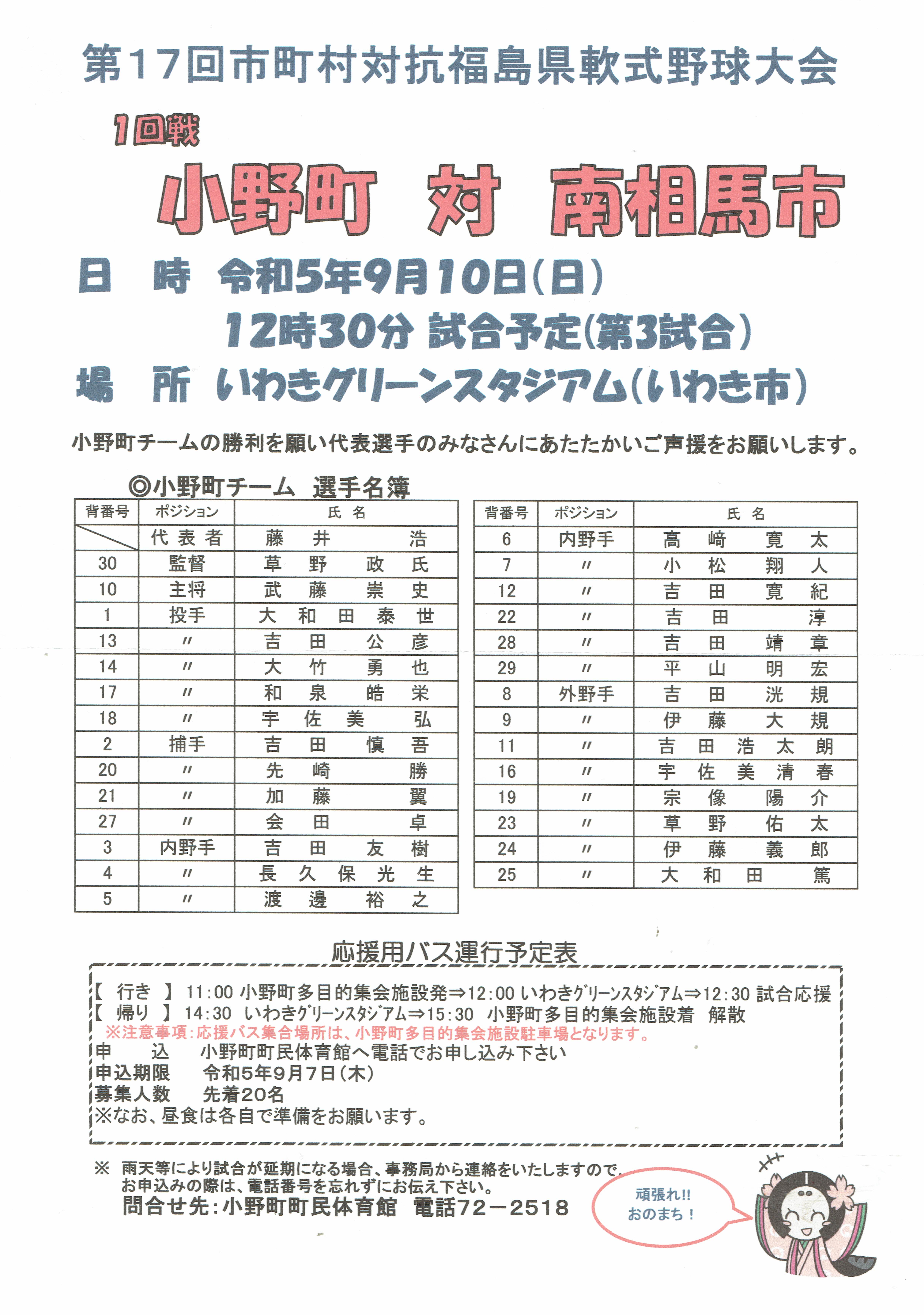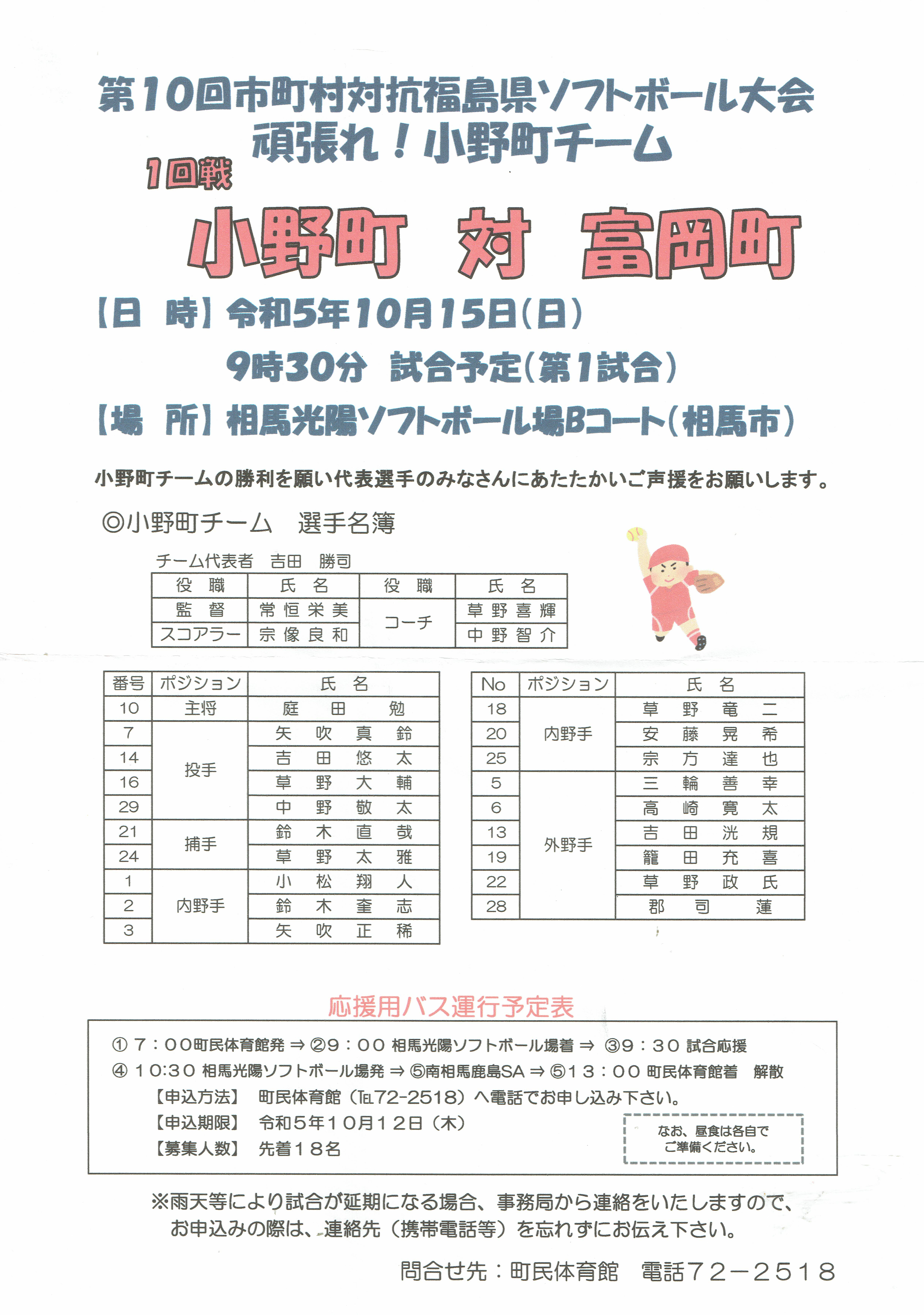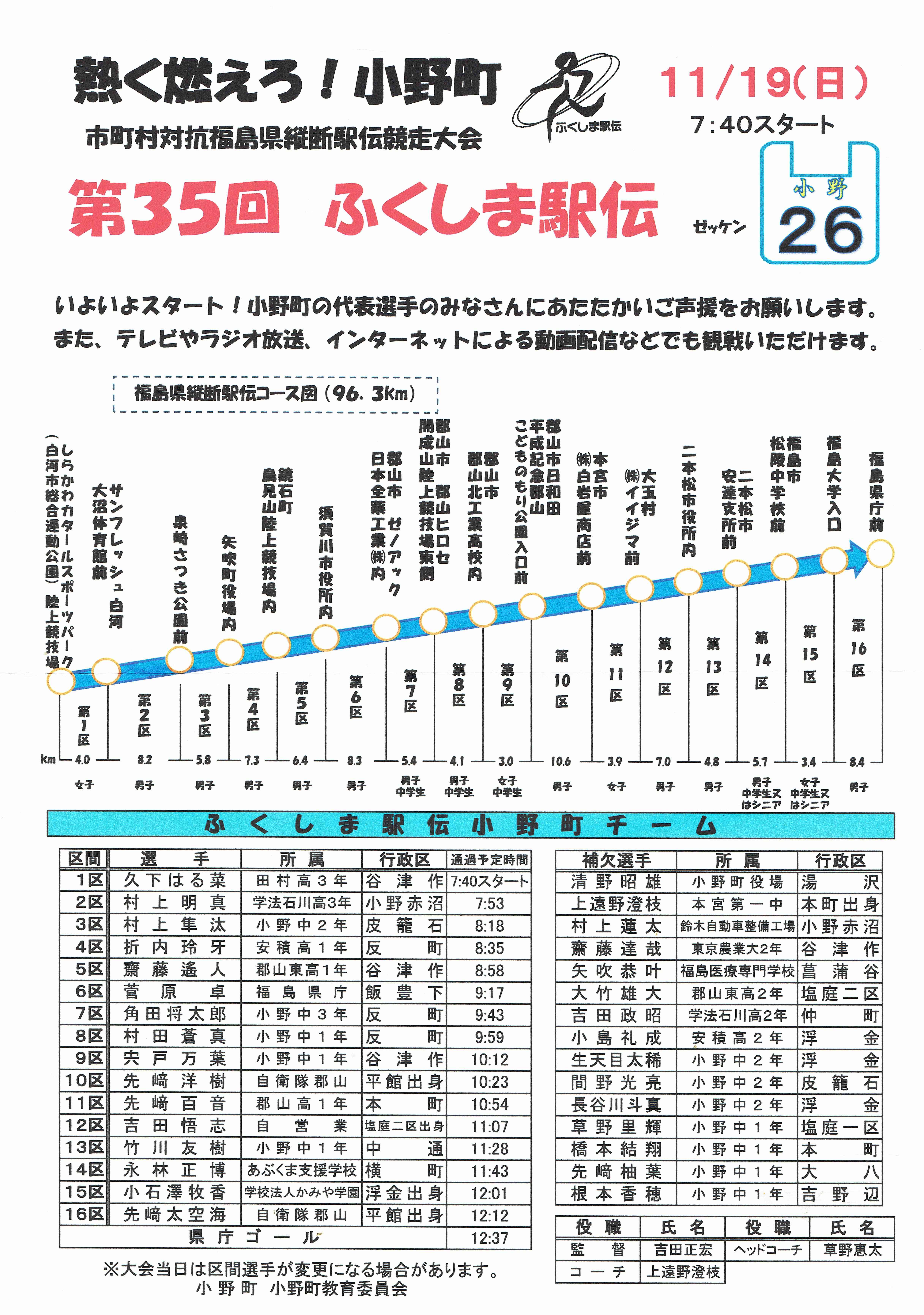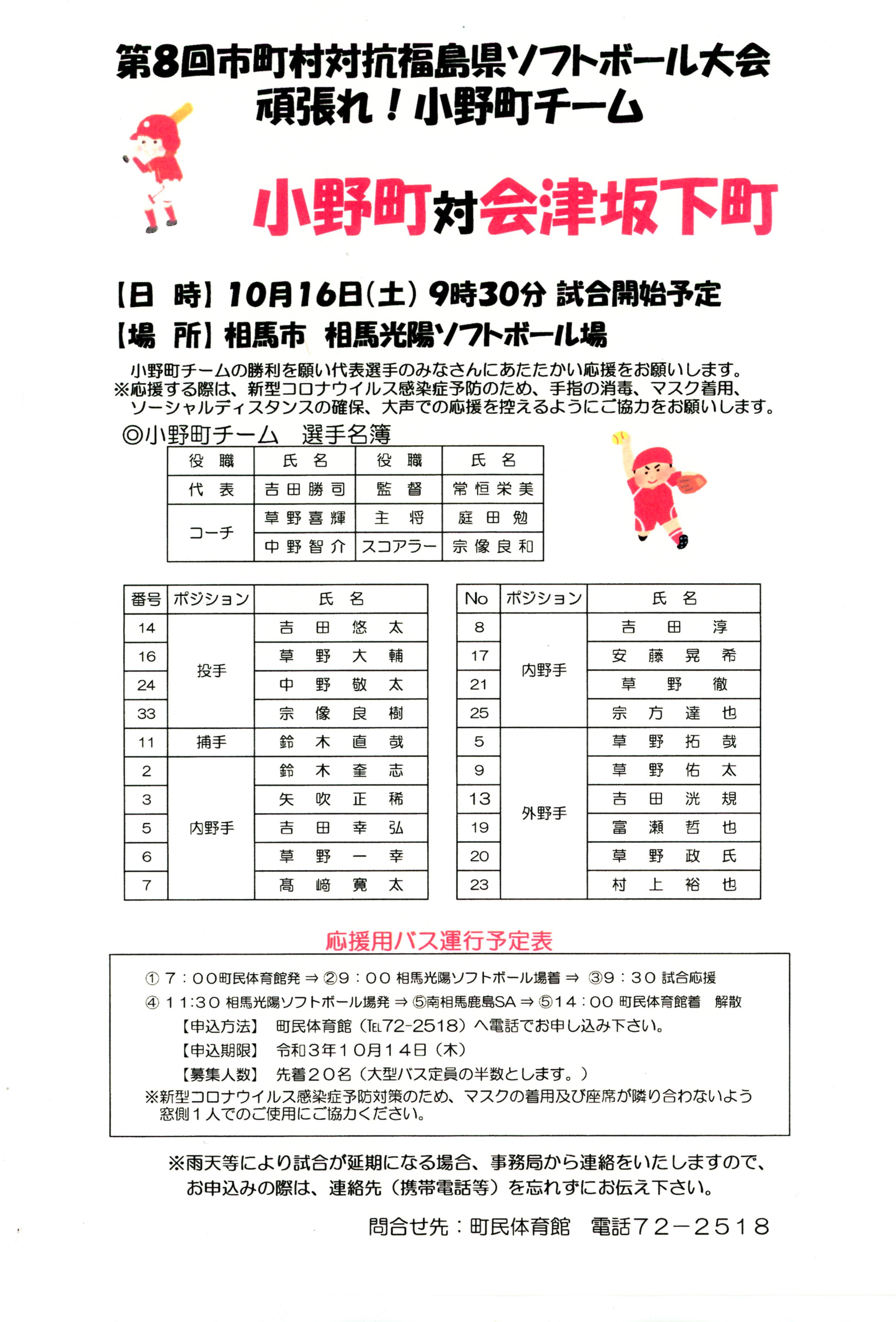 第33回ふくしま駅伝:熱く燃えろ!小野町 (2021.11.21開催済み) 小野町チームの成績は、 総合成績 28位(全50チーム参加) 町の部 11位(全27チーム参加) で敢闘賞を受賞した。 上記以外に、市の部(全13チーム)、村の部(全9チーム)、7町村連合チームの「希望ふくしま」(町の部・村の部にはエントリーせず)がありました。 小野町を初め、選手の皆様、スタッフの皆様、お疲れさまでした。 福島県ソフトボール大会:がんばれ小野町 (2021.10.16(土)9時30分試合開始予定) |