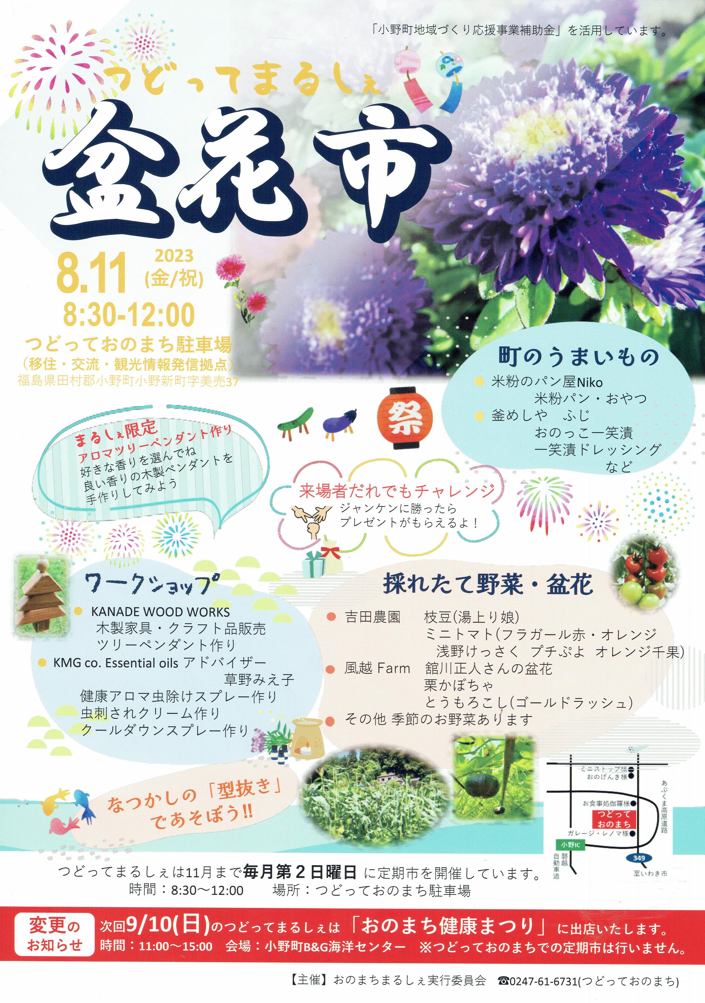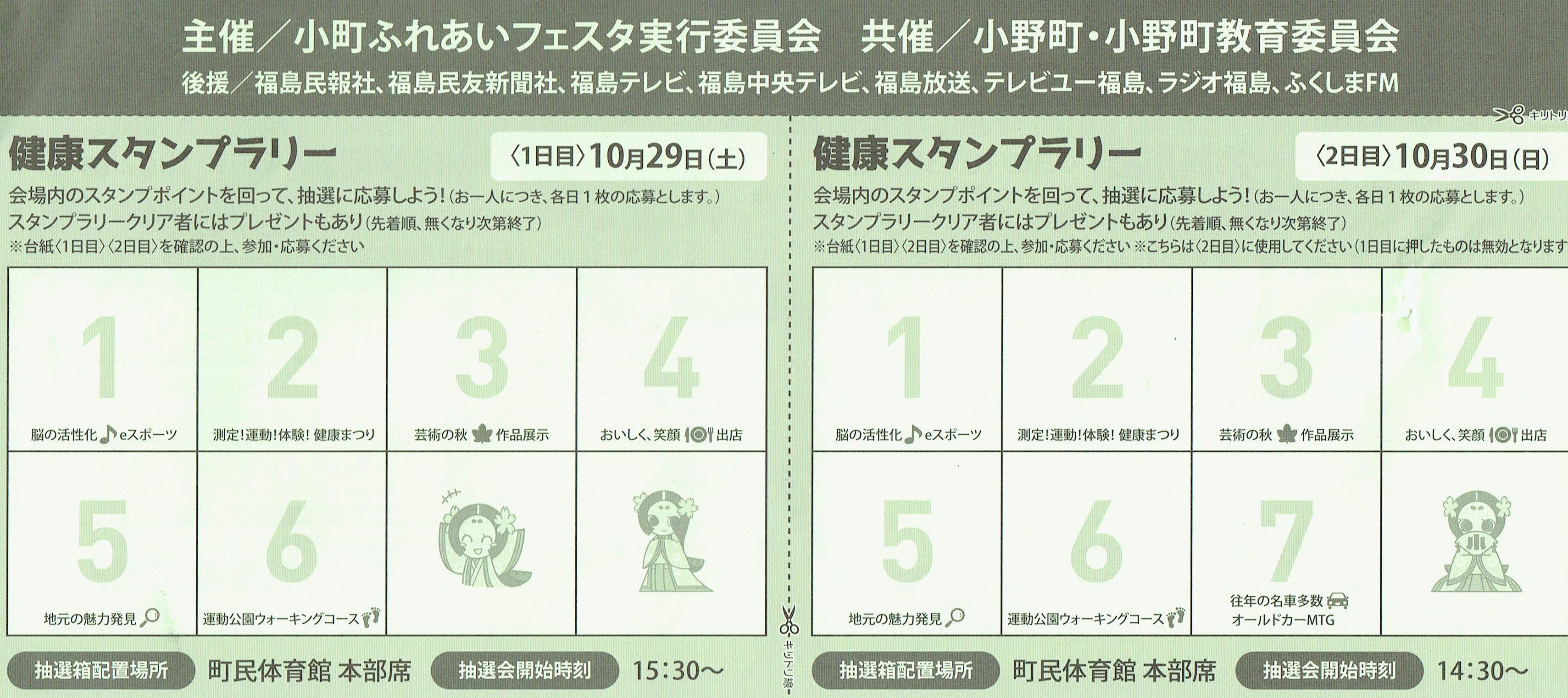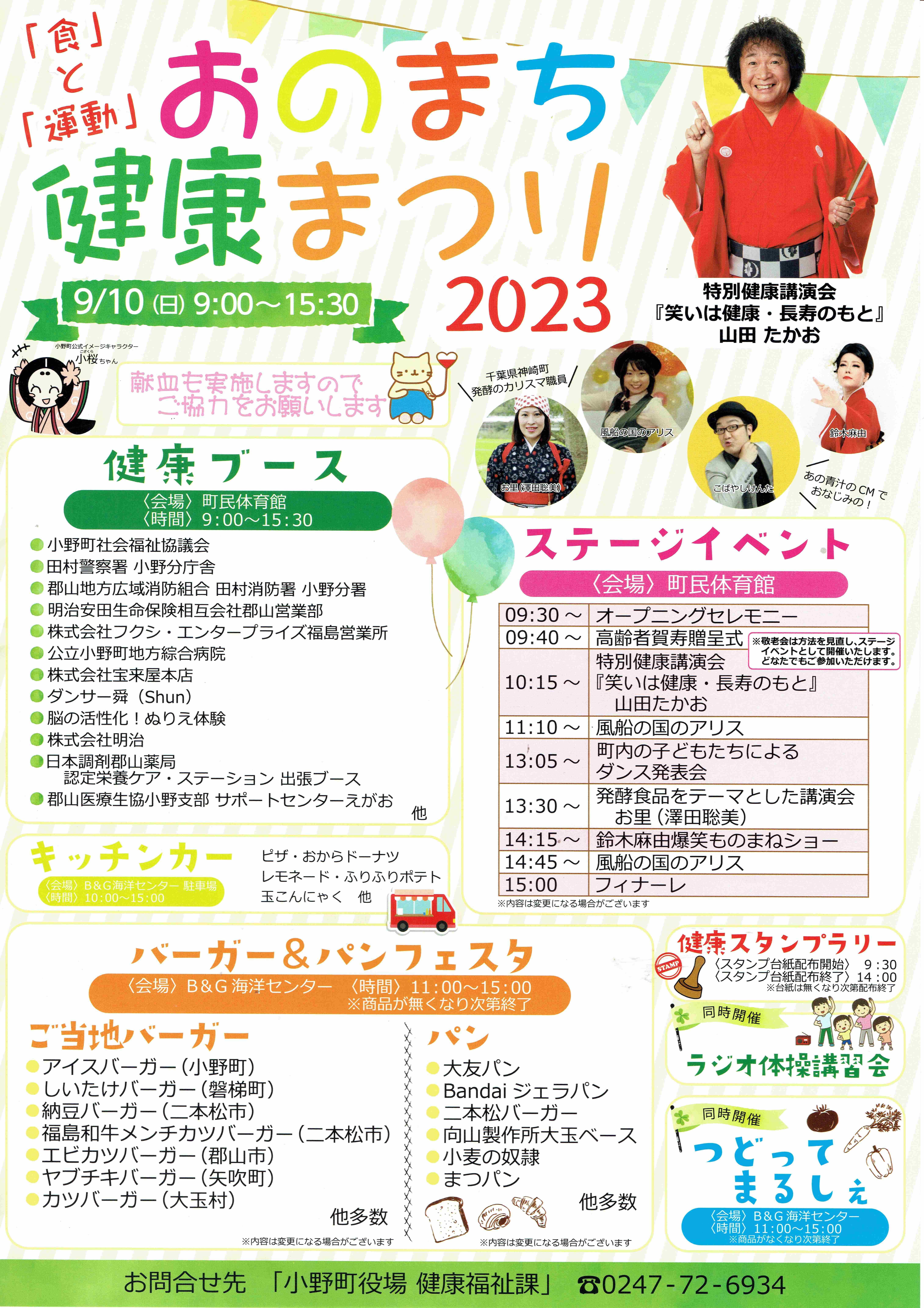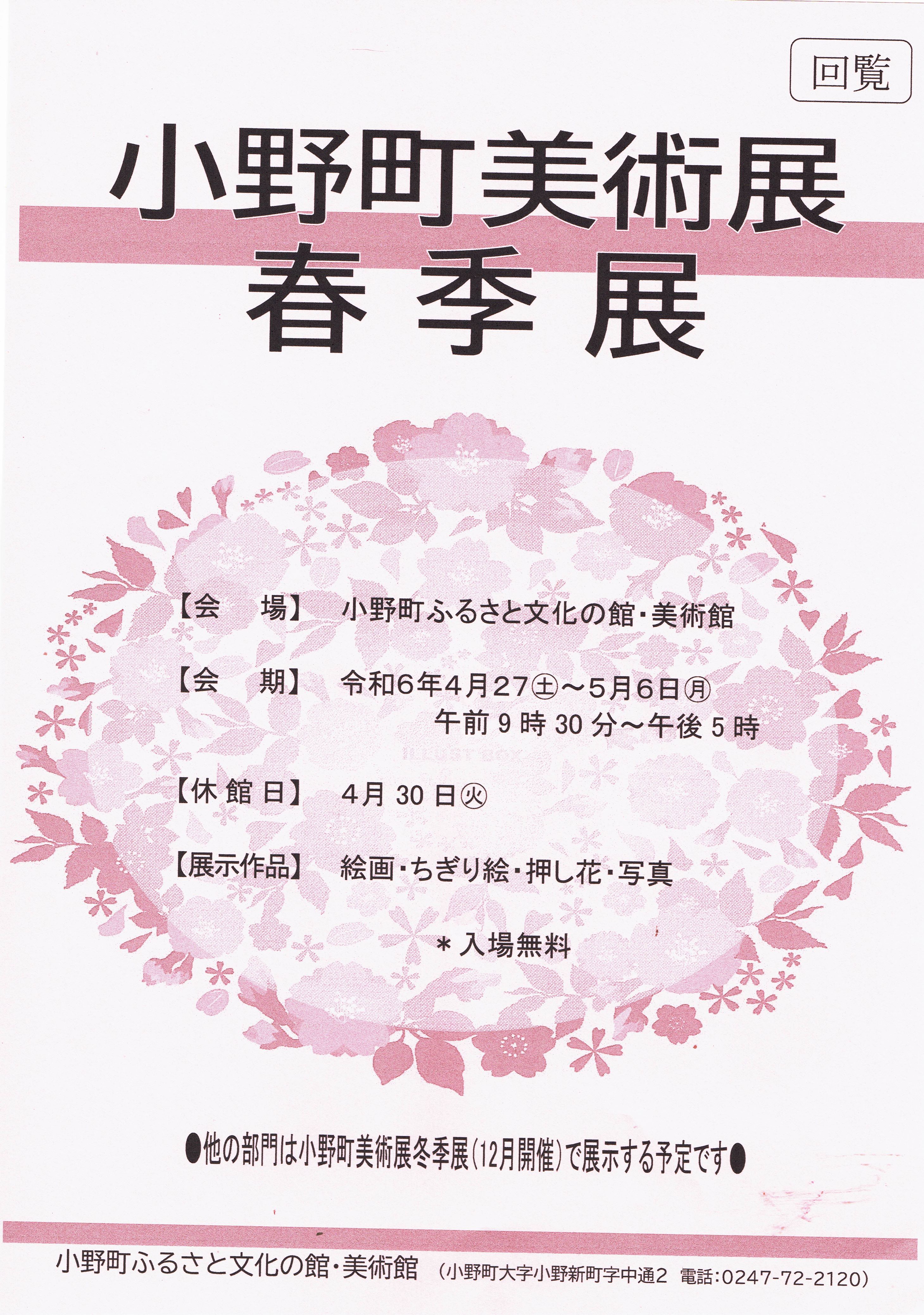 | 今日(2024/07/14 AM)の小野町 | | 中学校野球大会(民報杯、小野運動公園内) 船引中 VS 小原田中 | | | | | | 中学校卓球大会(小野運動公園内) | | | ビーチバレー 第17回こまち大会(小野運動公園内) | | | COMCOM創業祭(COMCOM駐車場内) | | | | | | 八雲神社・きゅうり天王祭(大字谷津作) | | | | | (トップページに戻る) 公立小野町地方綜合病院・院内ギャラリー(4/1~6/E) (出典:福島民報 2024年(令和6年)4月2日・11面掲載) 公立小野町地方綜合病院・院内ギャラリー(2/1~3/E予定) (出典:福島民報 2024年(令和6年)2月9日11面掲載) ルポ 「鹽竈神社例大祭」へ 第10回 (福島県)市町村対抗 県ソフトボール大会 終了 優勝:伊達市 準優勝:国見町 ベスト8:小野町