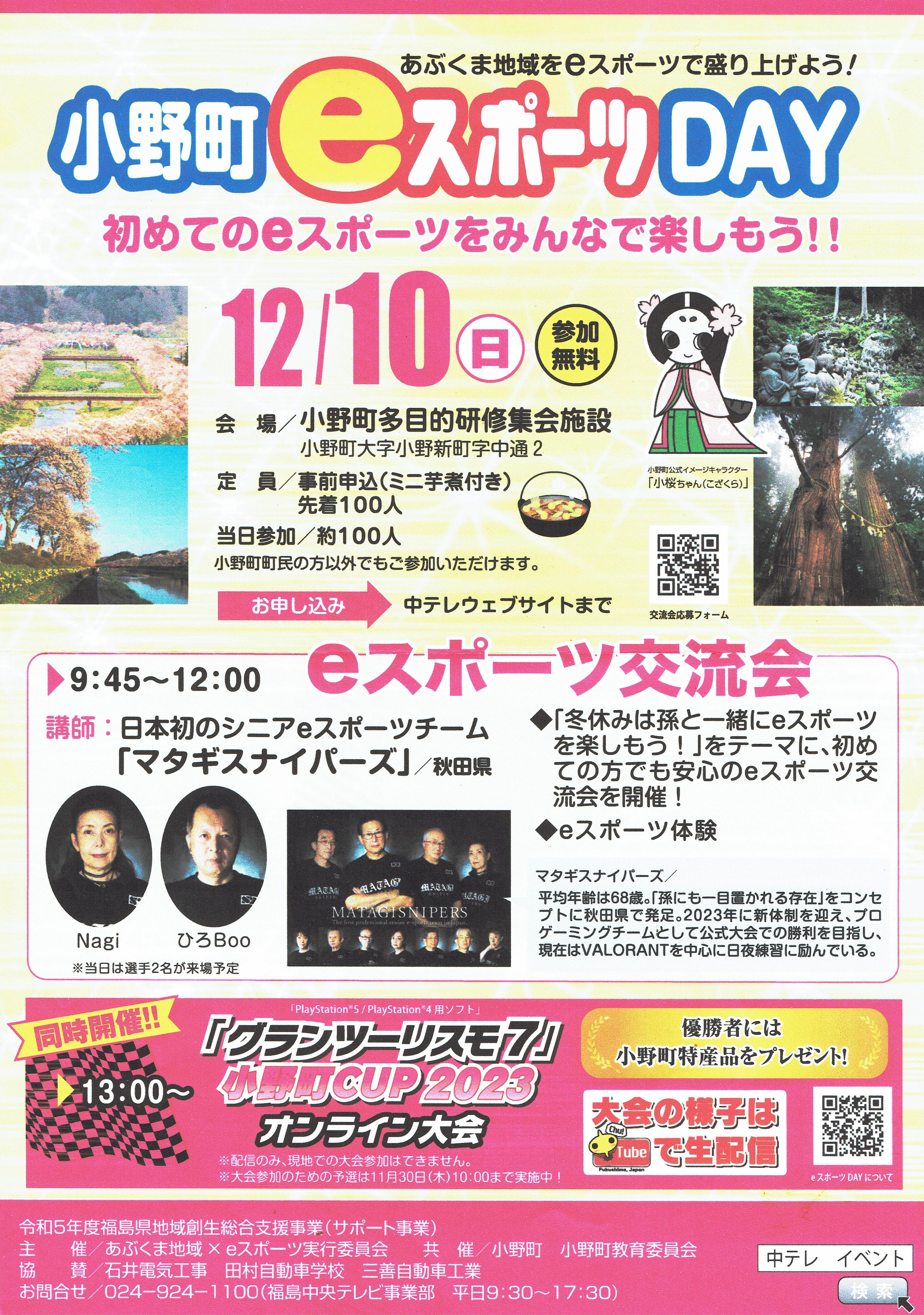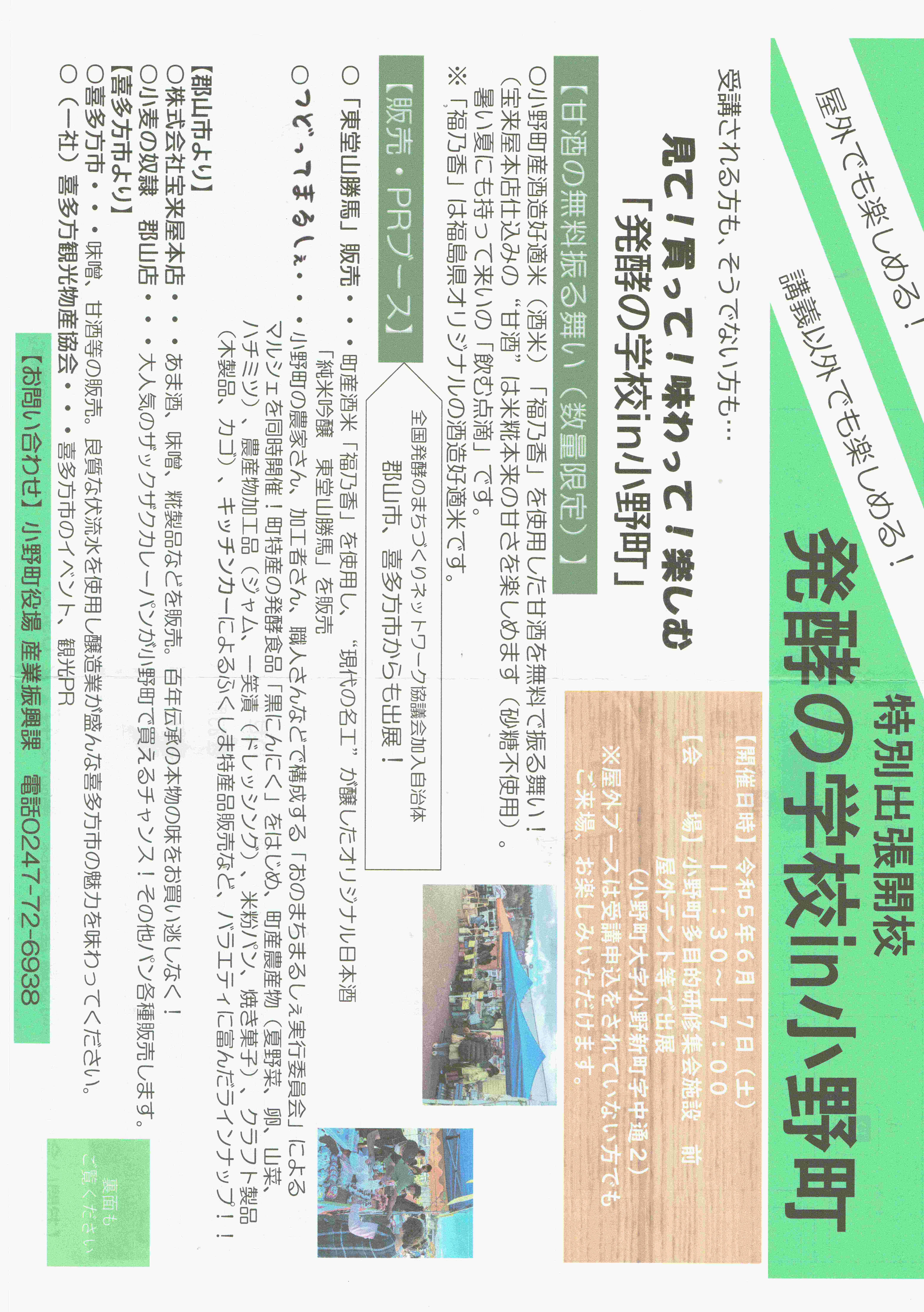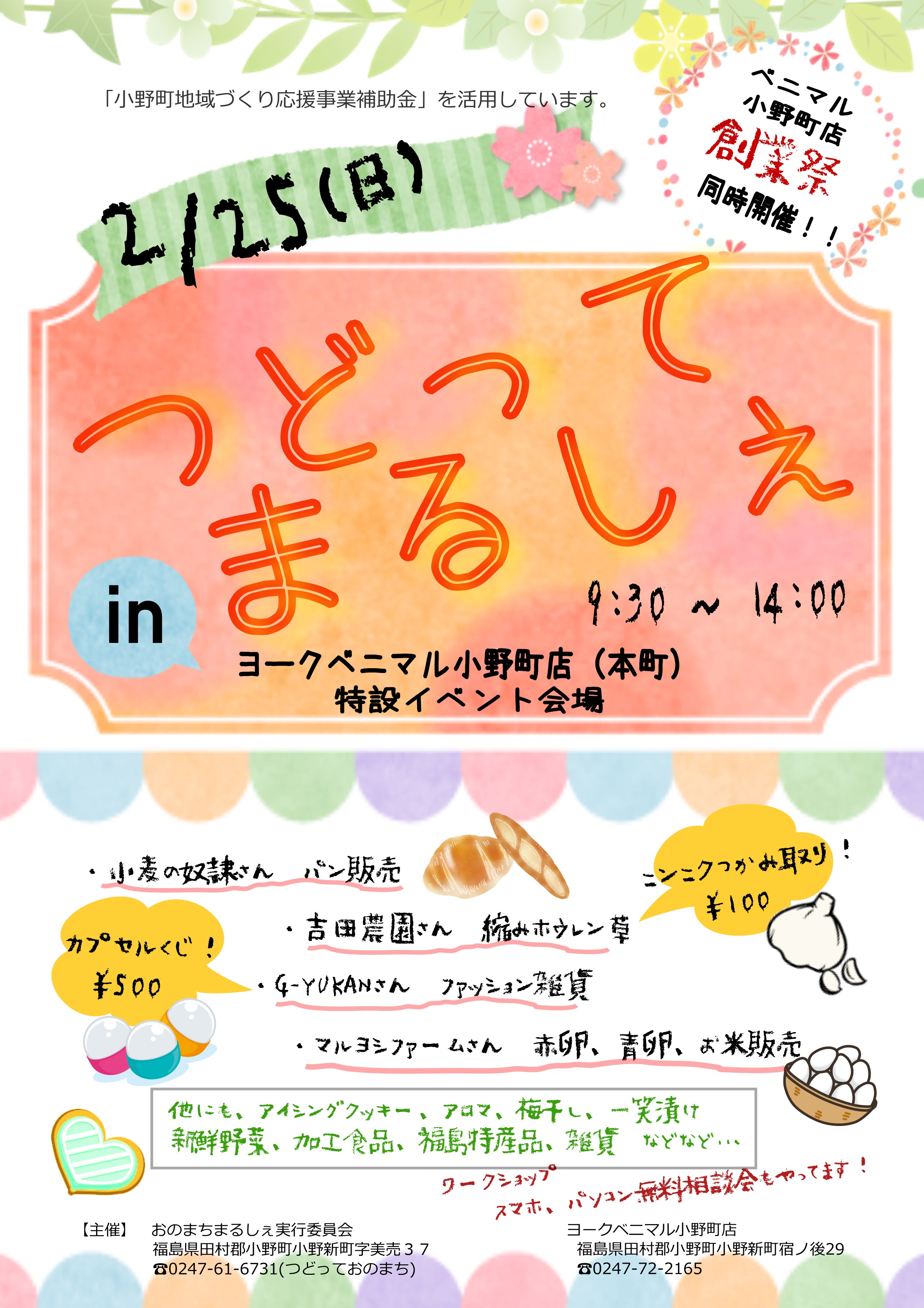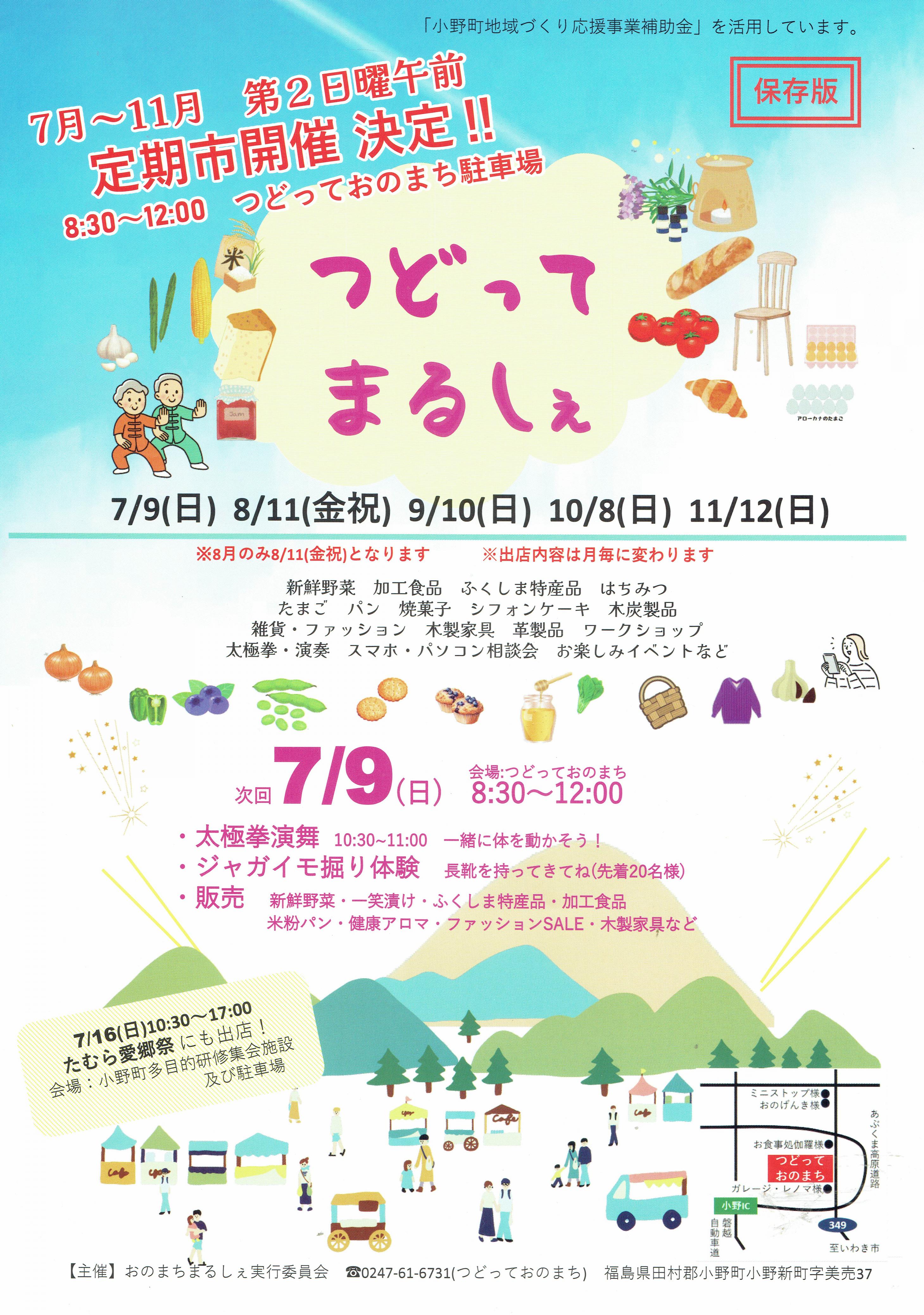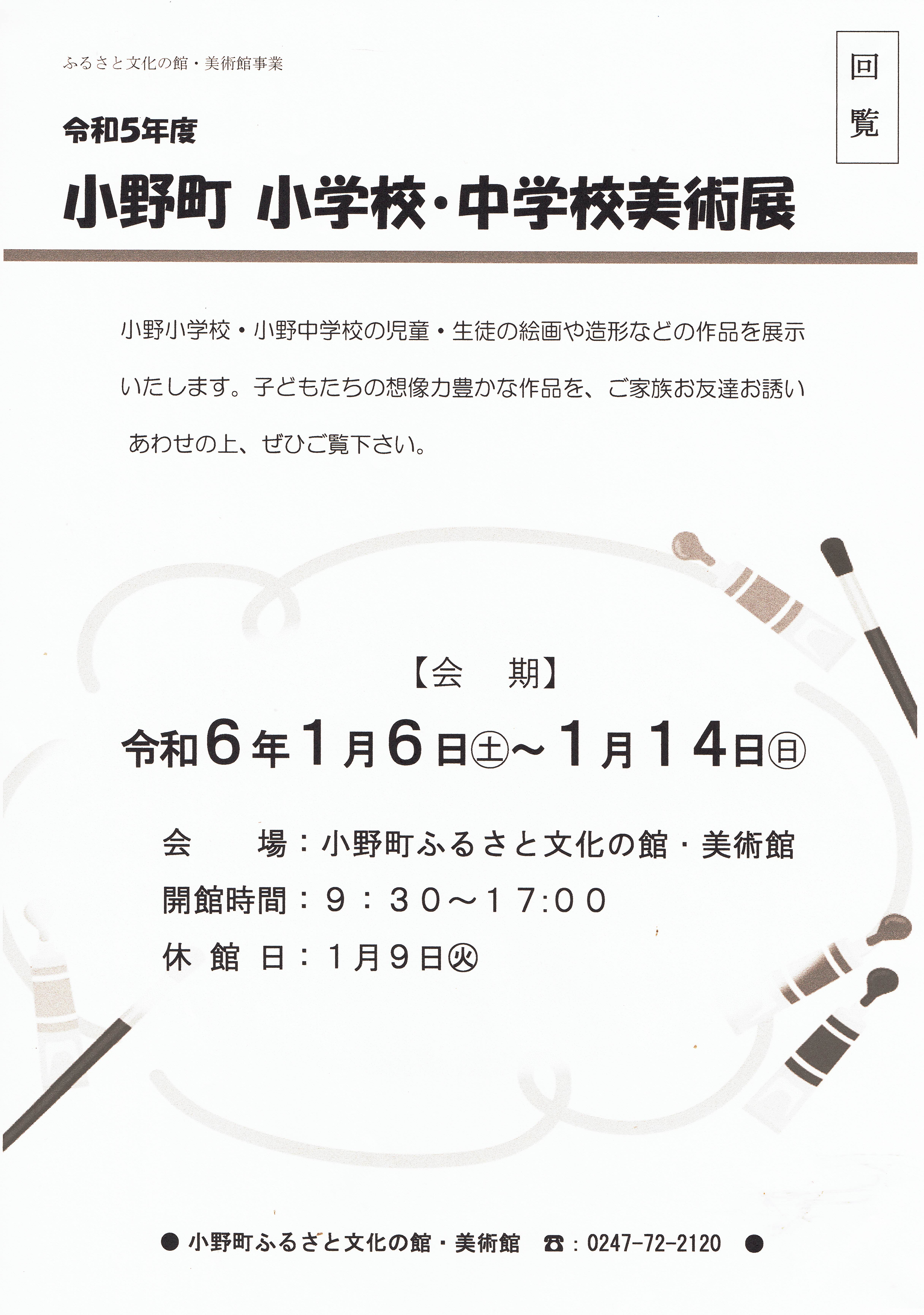 | 今日(2024/07/14 AM)の小野町 | | 中学校野球大会(民報杯、小野運動公園内) 船引中 VS 小原田中 | | | | | | 中学校卓球大会(小野運動公園内) | | | ビーチバレー 第17回こまち大会(小野運動公園内) | | | COMCOM創業祭(COMCOM駐車場内) | | | | | | 八雲神社・きゅうり天王祭(大字谷津作) | | | | | (トップページに戻る) 公立小野町地方綜合病院・院内ギャラリー(4/1~6/E) (出典:福島民報 2024年(令和6年)4月2日・11面掲載) 公立小野町地方綜合病院・院内ギャラリー(2/1~3/E予定) (出典:福島民報 2024年(令和6年)2月9日11面掲載) ルポ 「鹽竈神社例大祭」へ 第10回 (福島県)市町村対抗 県ソフトボール大会 終了 優勝:伊達市 準優勝:国見町 ベスト8:小野町