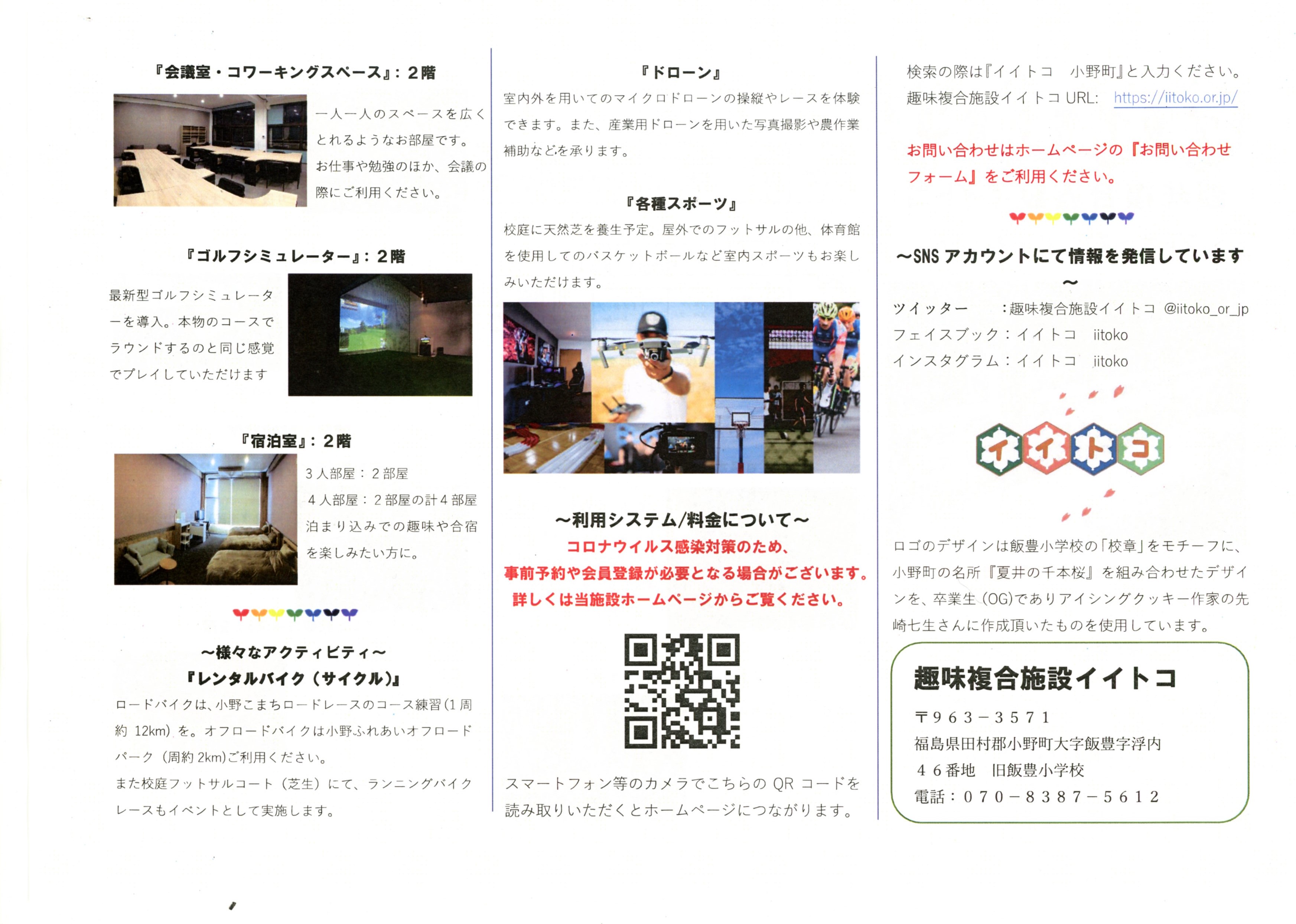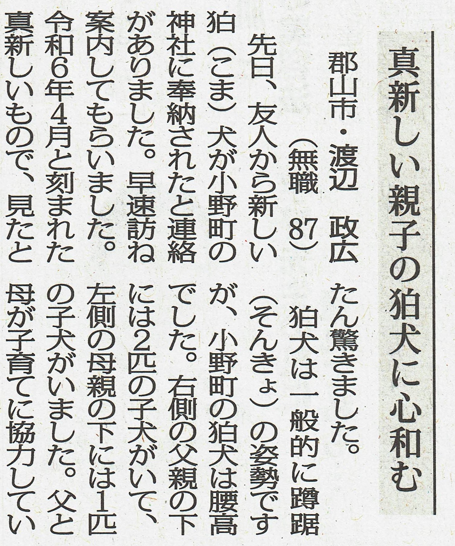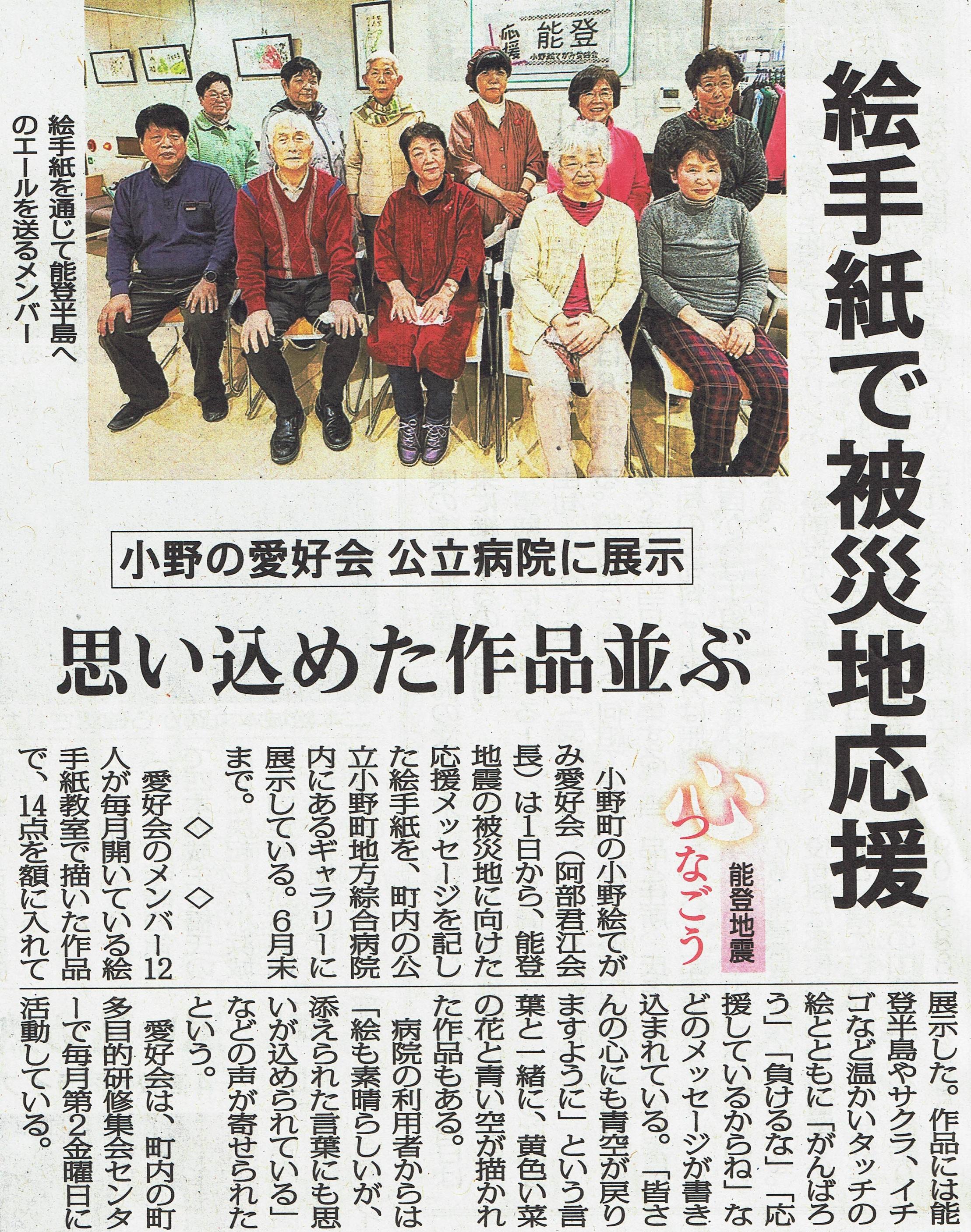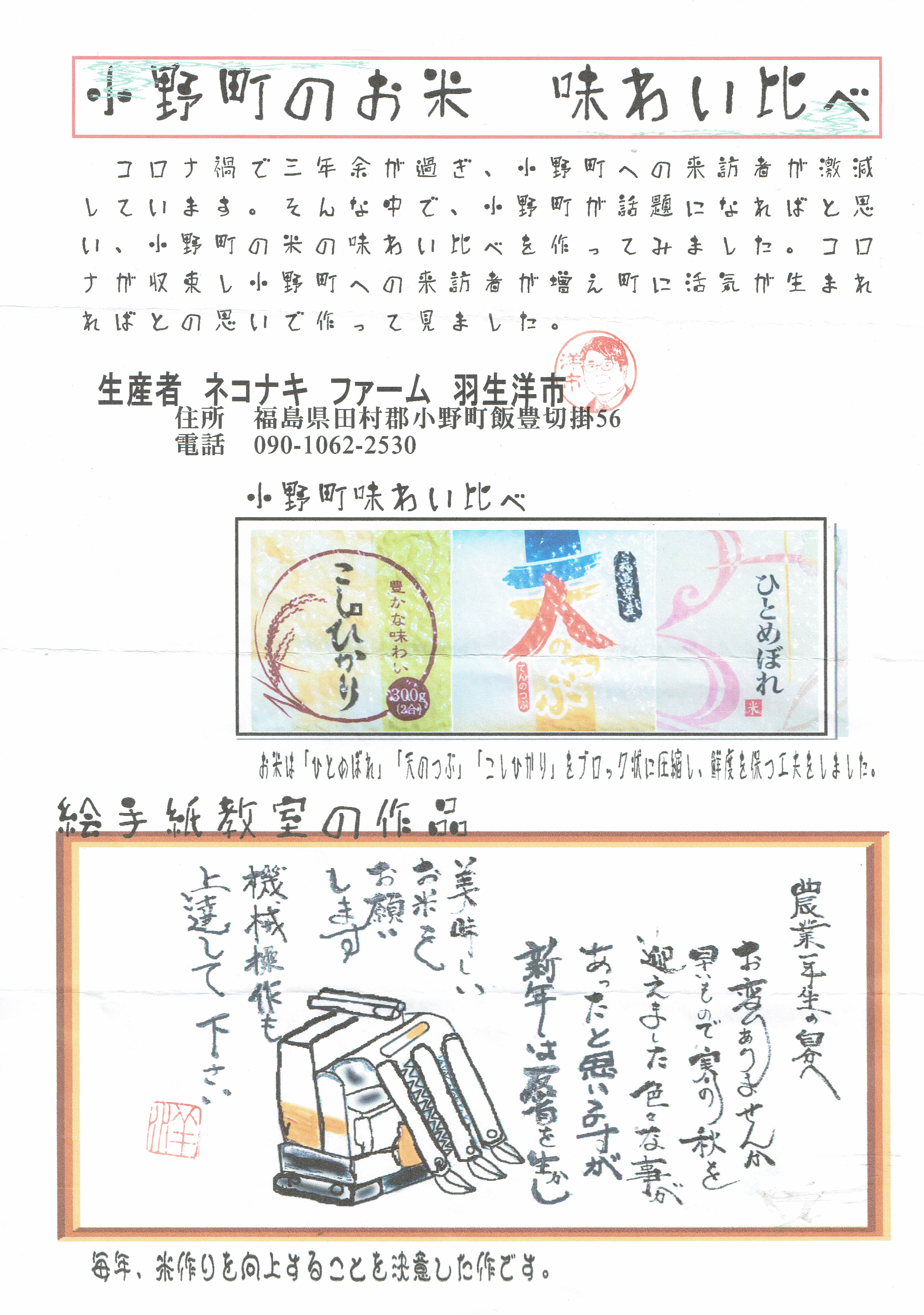 | ガンバる・小野町 〔2024/07/15更新〕 八重山in小野町(2024/06/29終了) 出典:福島民報 2024年(令和6年)5月5日・3面掲載 出典:福島民報 2024年(令和6年)5月2日 みんなのひろば掲載 (出典:福島民報 2024年(令和6年)4月2日・11面掲載) 11/02 ライブ報告 「小野町絵てがみ愛好会」&「ネコナキ ファーム」
