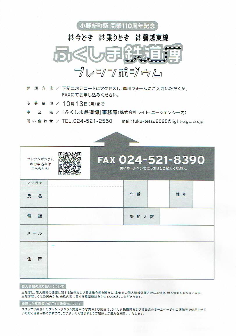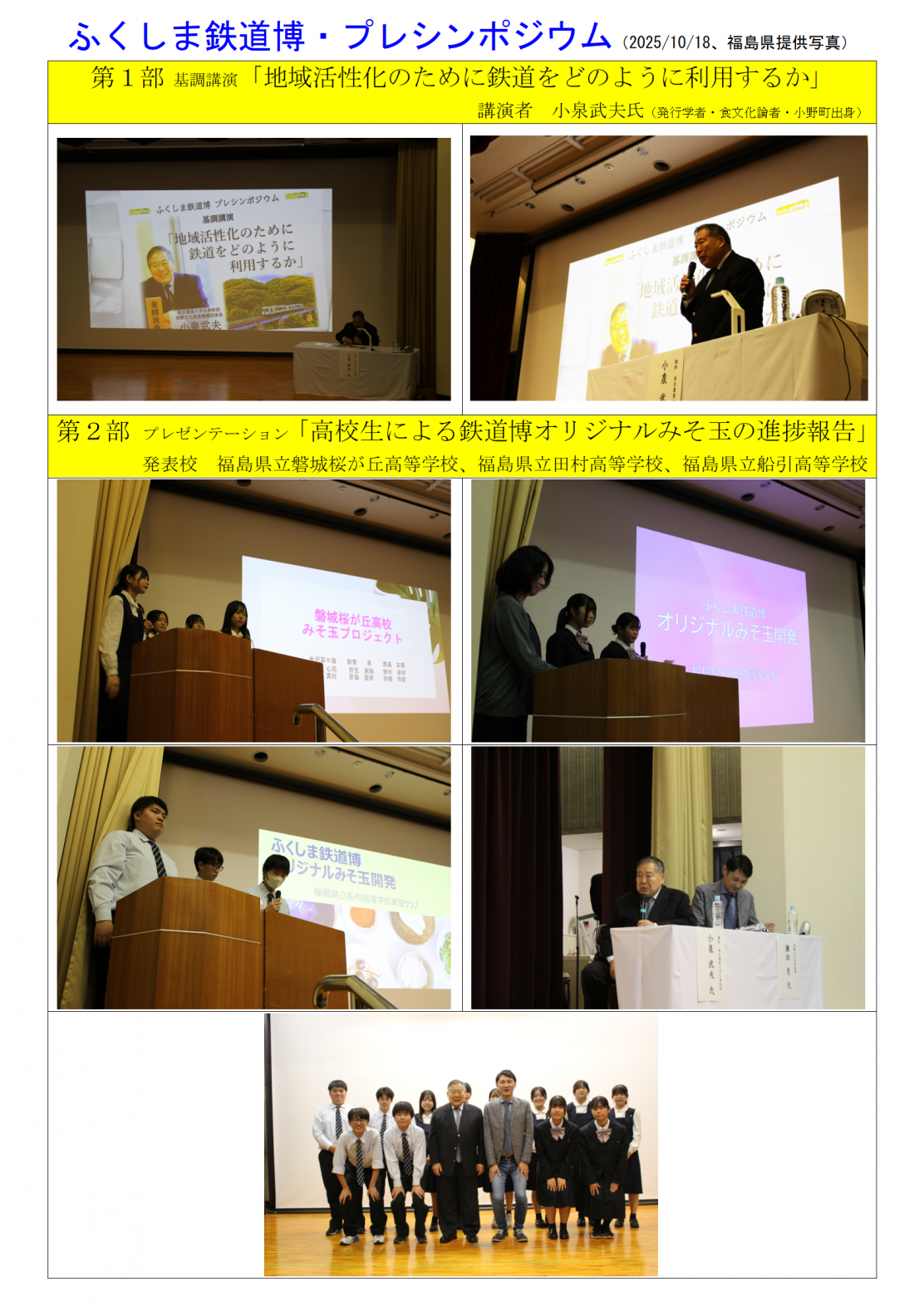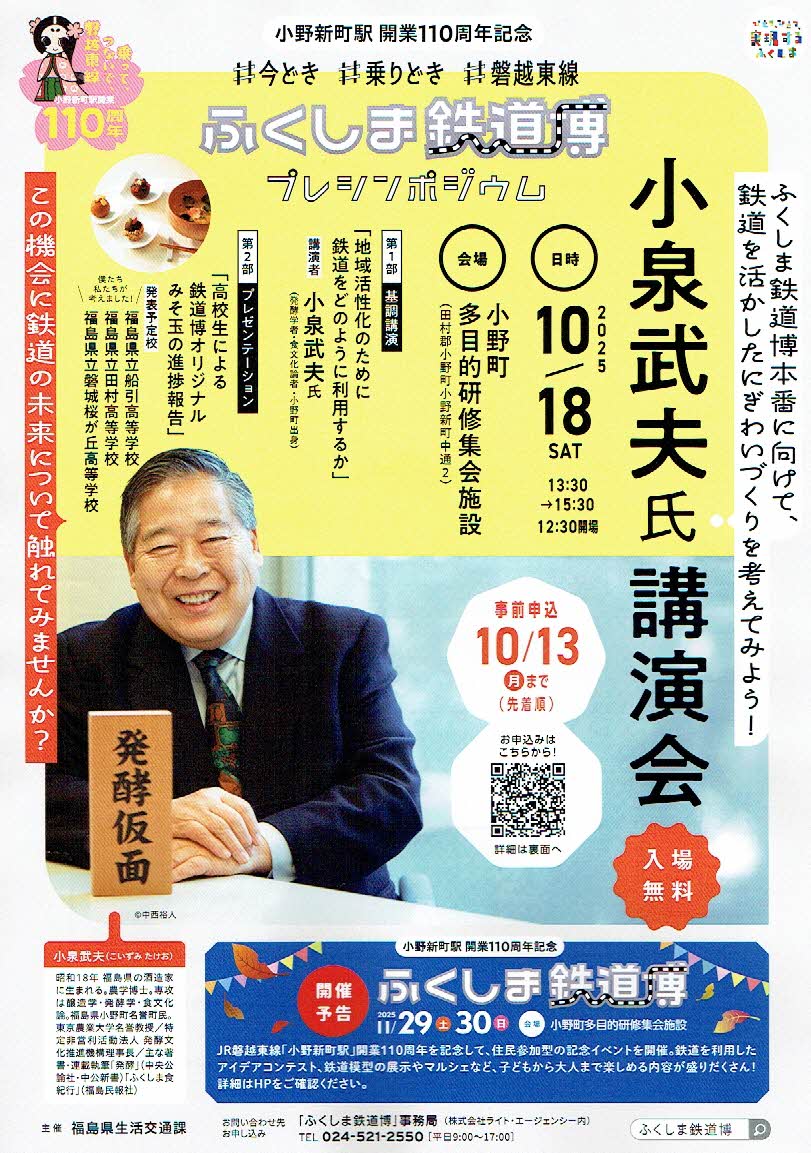 | 令和7年10月18日(土) | ふくしま鉄道博プレシンポジウム (小泉武夫氏公演、 高校生鉄道グルメ開発進捗報告) | 小野町多目的 研修集会施設 | 福島県 |