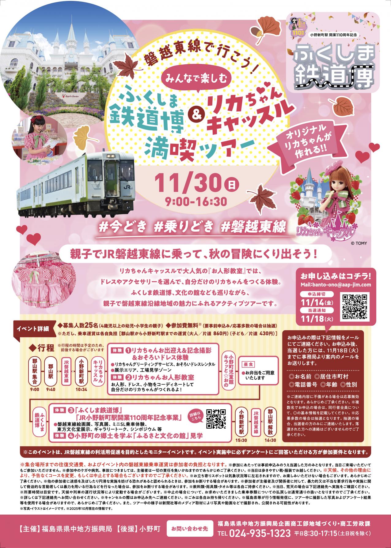 | 令和7年11月30日(日) | 磐越東線で行こう! ふくしま鉄道博 & リカちゃんキャッスル 満喫ツァー (予約制) | 郡山駅⇔小野新町駅 | 福島県 県中 地方 振興局 |