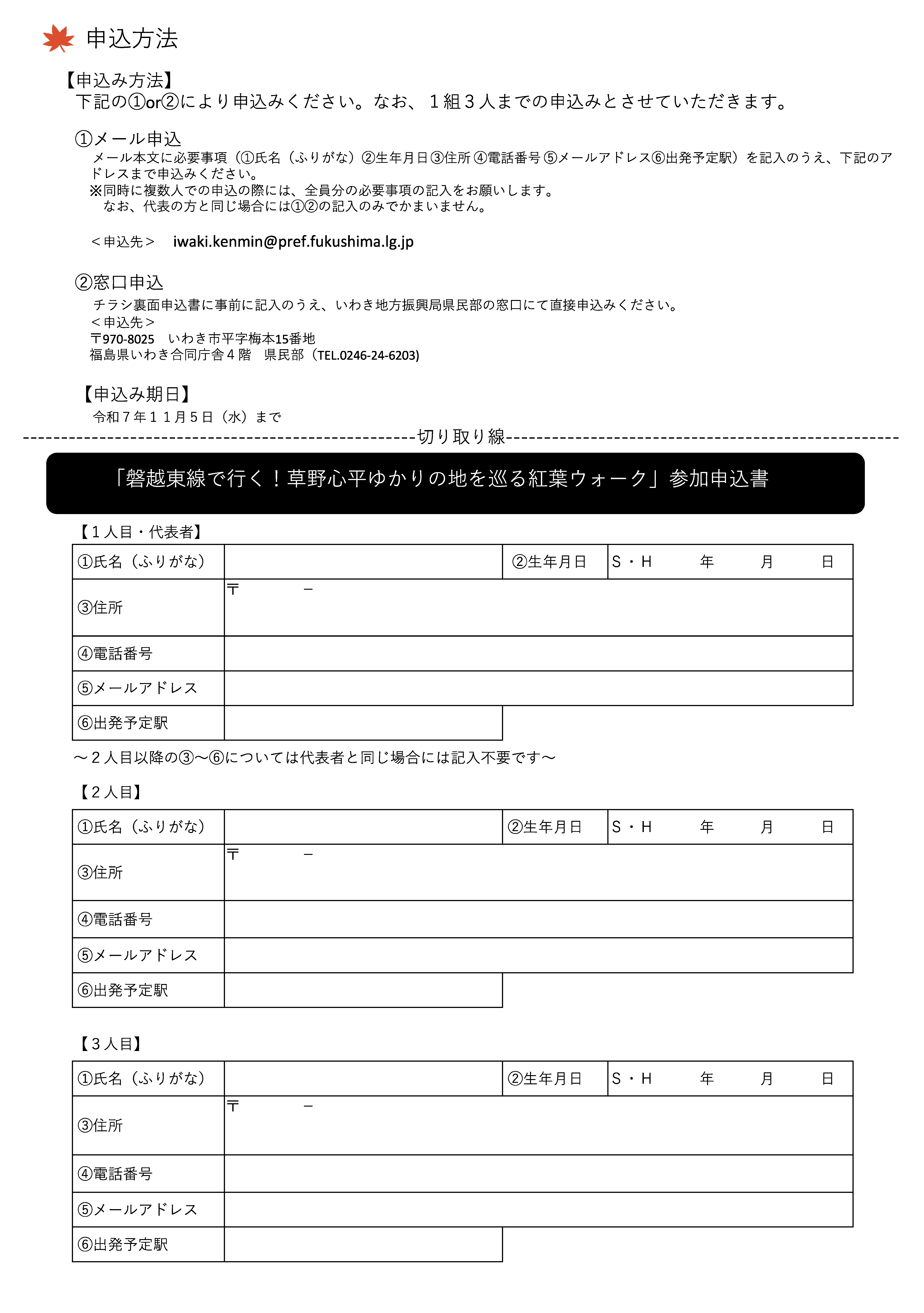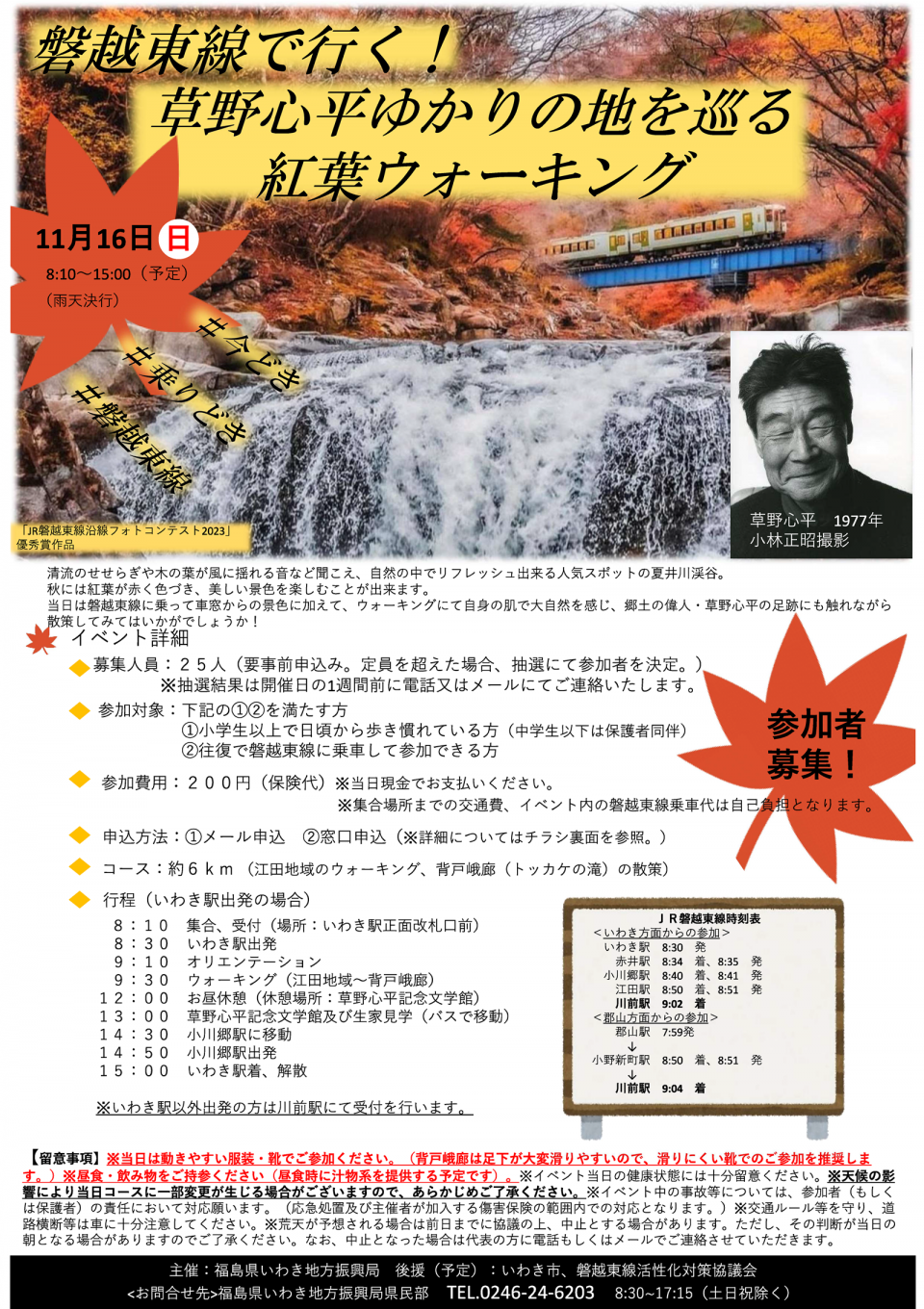 令和7年11月16日(日) | 磐越東線で行く! 草野心平ゆかりの地を巡る 紅葉ウォーキング (予約制) | いわき駅⇔小川郷駅 | 福島県 いわき 地方 振興局 |